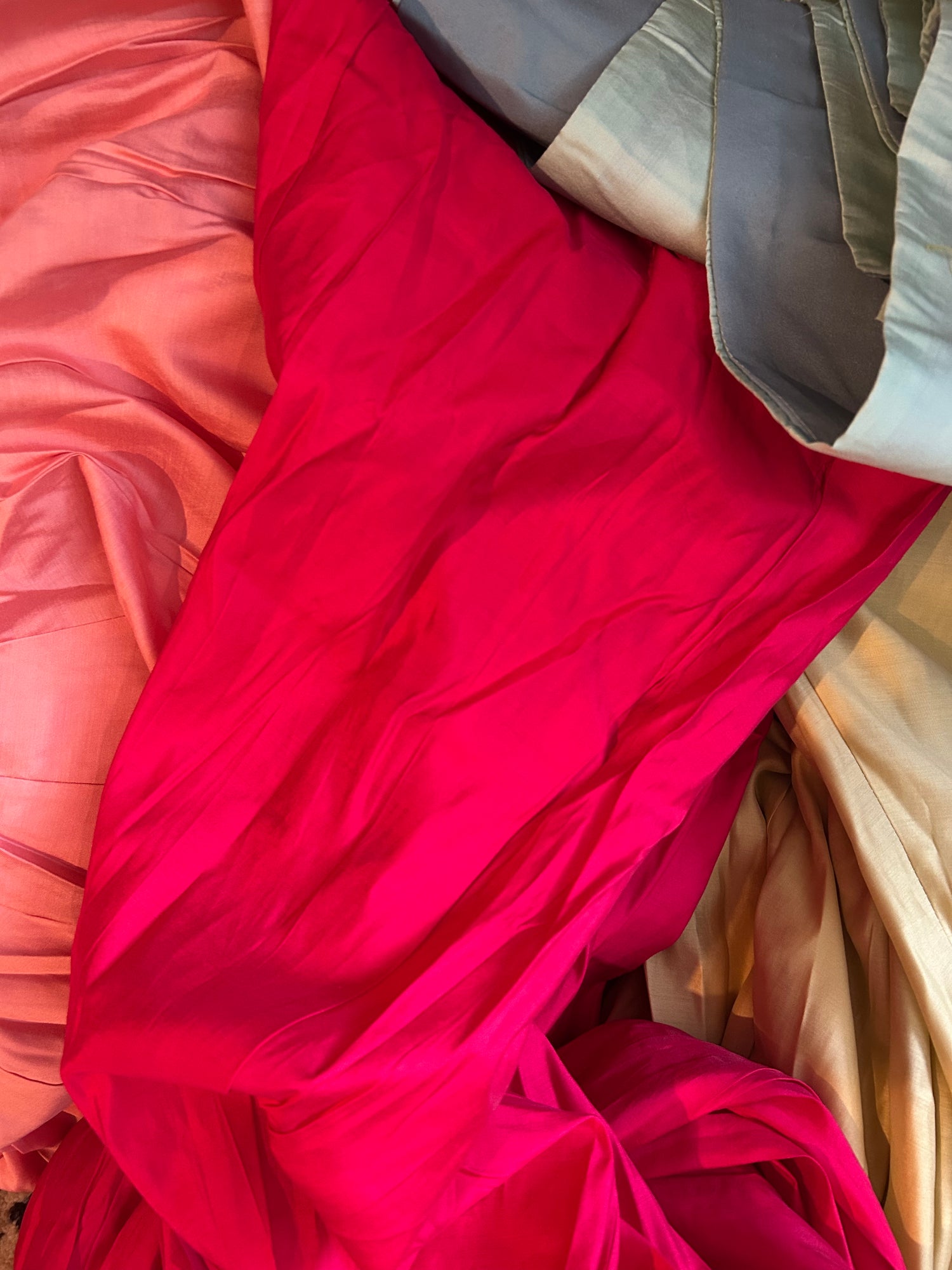 Chanderi silk- known as the jewel of Madhya Pradesh. Named for its place of origin, around 60% of the population of the town of Chanderi is involved in the production of this textile. Its lightweight, making it perfect for India’s hot summers, but also versatile enough to create innumerable designs and products. We’ve used this luxurious fabric in our corsets, lehengas and dupattas- hand dyed in a range of stunning shades.