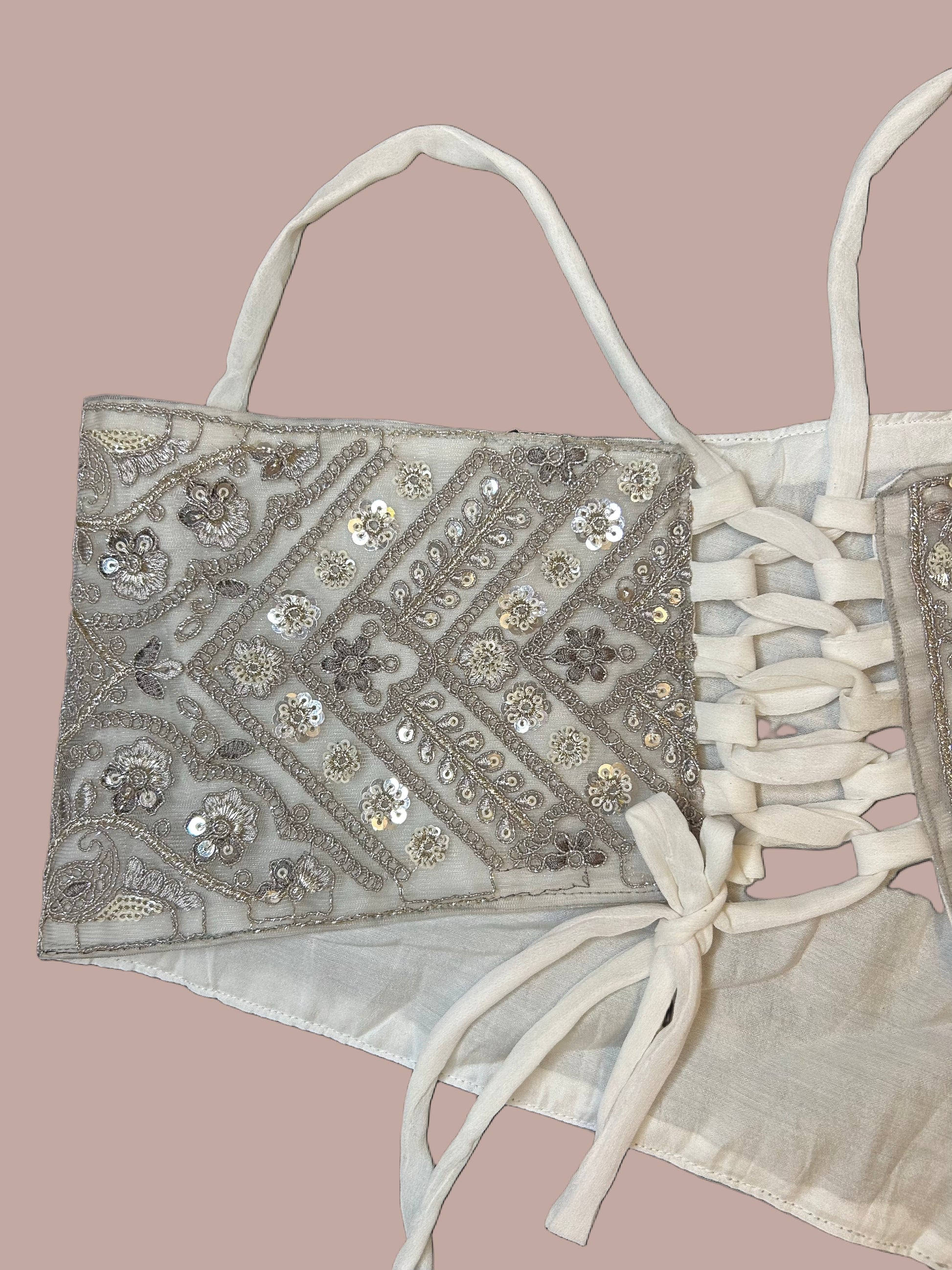 White organza with a cotton lining. Heavily embroidered with traditional Zari embroidery in silver thread and a whole load of sequins. We can promise you, it’s a head turner.